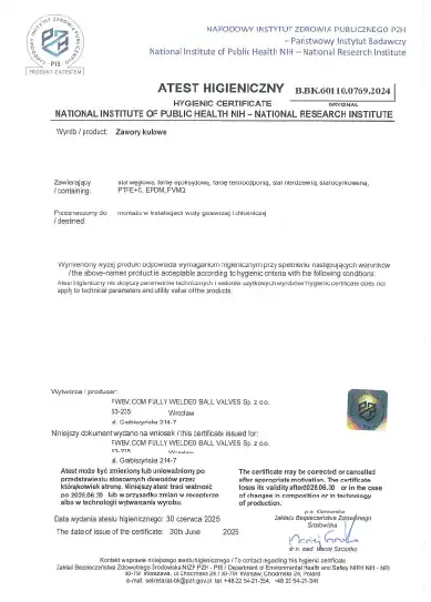 Atest higieniczny PZH dla zaworów kulowych FWBV