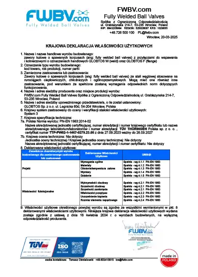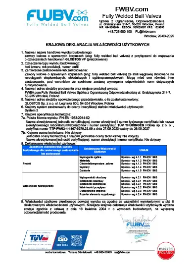 Krajowa deklaracja właściwości użytkowych (KDWU) dla zaworów GLOBTOS W (do wspawania) i GLOBTOS F (kołnierzowe)