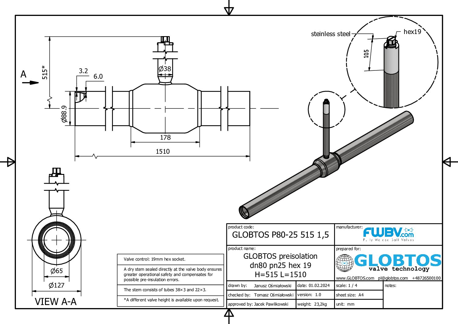 Professional weld/weld (w/w) ball valve by Polish manufacturer GLOBTOS. The DN80 PN25 model with reduced bore bore is a reliable solution for district heating networks, industrial installations, and transmission pipelines. Its robust construction eliminates the risk of leaks and guarantees many years of maintenance-free operation.