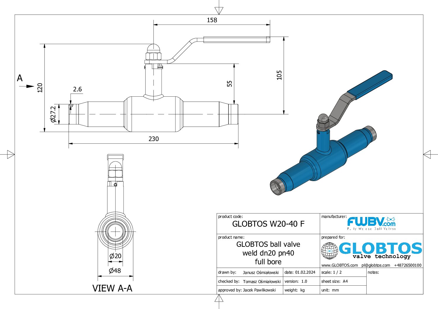 GLOBTOS W20-40 F | Weld/Weld (W/W) ball valve DN20 PN40 – full bore bore, fully weld/weld (w/w) design, leakage class A, made of high-quality materials. ✓ 24h shipping. Polish manufacturer with 35+ years of experience.