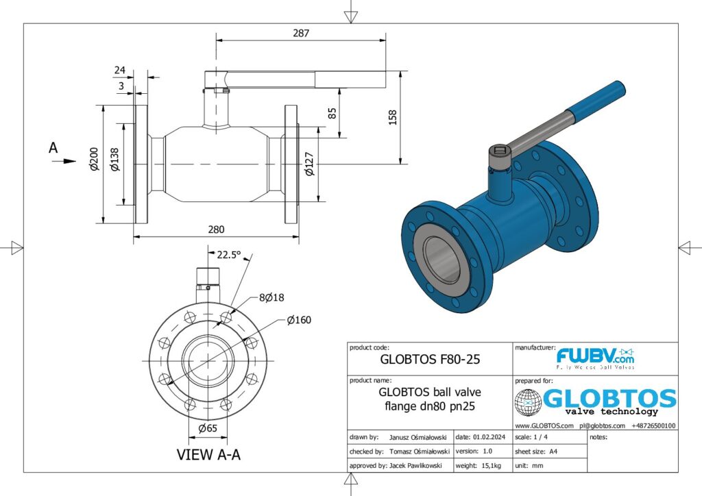 GLOBTOS F80-16 | Zawór kulowy kołnierzowy DN80 PN25 – spawany korpus, kołnierze EN 1092-1, klasa szczelności A. ✓ Wysyłka 24h. Łatwy montaż i serwis. Polski producent.