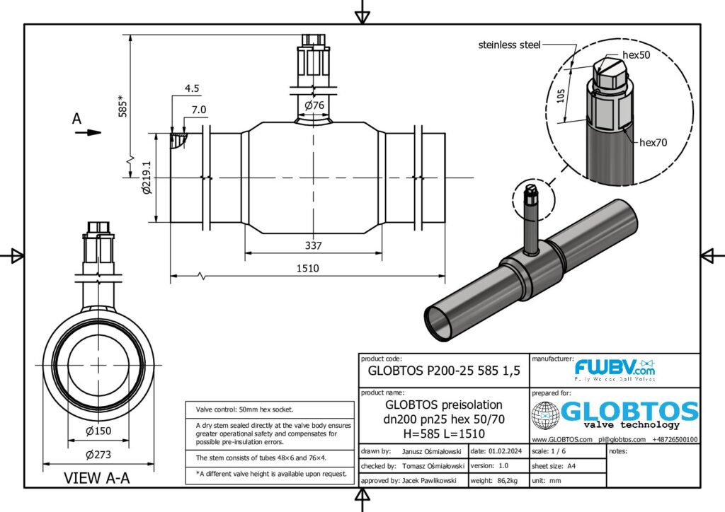 GLOBTOS P200-25 585 1,5 | Zawór do preizolacji DN200 PN25 – przedłużony trzpień EN 488, stal nierdzewna, do montażu podziemnego. ✓ Wysyłka 24h. Sieci ciepłownicze preizolowane.