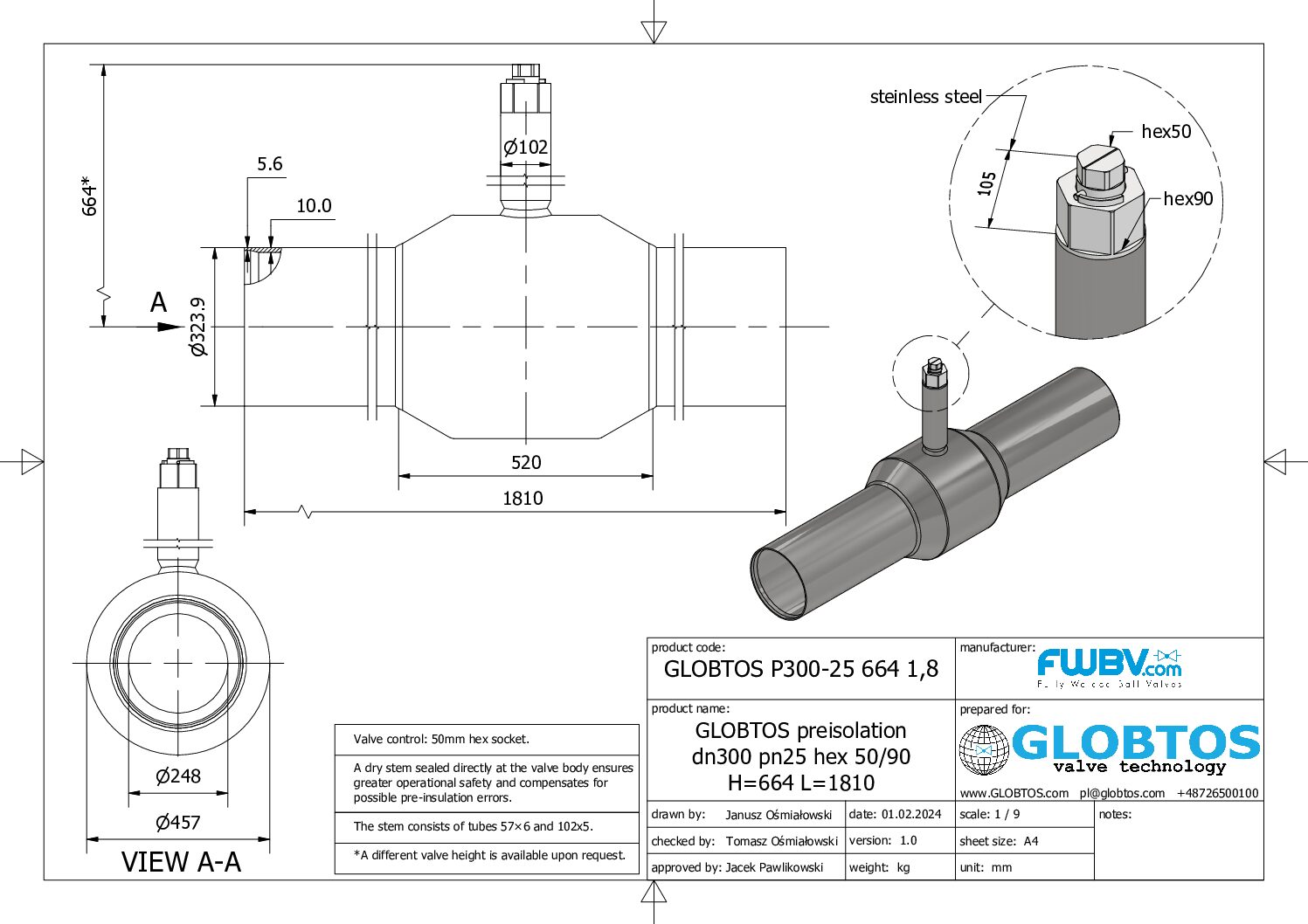 Kompaktowa armatura dla sieci podziemnych. Zawór kulowy GLOBTOS DN300 PN25 w wersji pod klucz (trzpień sześciokątny) do preizolacji z redukcją przepływu to ekonomiczne rozwiązanie dla podziemnych sieci ciepłowniczych z technologią suchego trzpienia.