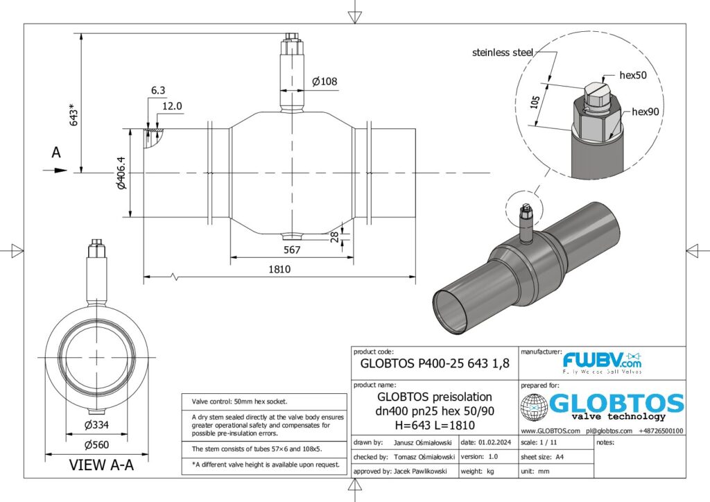 Kompaktowa armatura dla sieci podziemnych. Zawór kulowy GLOBTOS DN400 PN25 w wersji pod klucz (trzpień sześciokątny) do preizolacji z redukcją przepływu to ekonomiczne rozwiązanie dla podziemnych sieci ciepłowniczych z technologią suchego trzpienia.