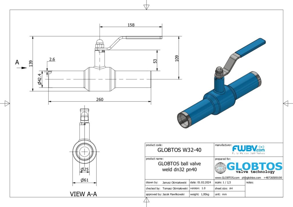 Zawór kulowy do wspawania – zredukowany przepływ DN32 PN40 | GLOBTOS