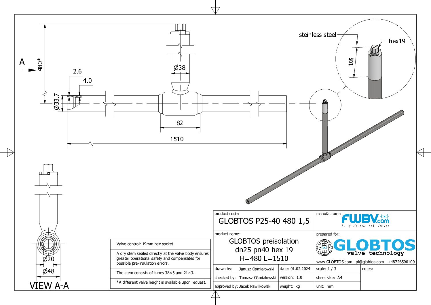 Kompaktowa armatura dla sieci podziemnych. Zawór kulowy GLOBTOS DN25 PN40 w wersji pod klucz (trzpień sześciokątny) do preizolacji z redukcją przepływu to ekonomiczne rozwiązanie dla podziemnych sieci ciepłowniczych z technologią suchego trzpienia.